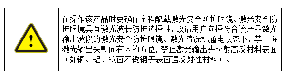 根據(jù)歐洲標(biāo)準(zhǔn)EN 60825-1,條款9,該設(shè)備內(nèi)部激光器屬于4類激光器。該產(chǎn)品發(fā)出波長在1064nm或1080nm附近的激光輻射,且由于輸出頭輻射出的平均功率大于150W,會對直接或間接地暴露于這樣的光強(qiáng)度下的眼睛和皮膚造成傷害。盡管該輻射不可見,光束仍會對視網(wǎng)膜或眼角膜造成不可恢復(fù)的傷害。在激光器運(yùn)行時必須佩帶合適且經(jīng)過認(rèn)證的激光防護(hù)眼鏡。